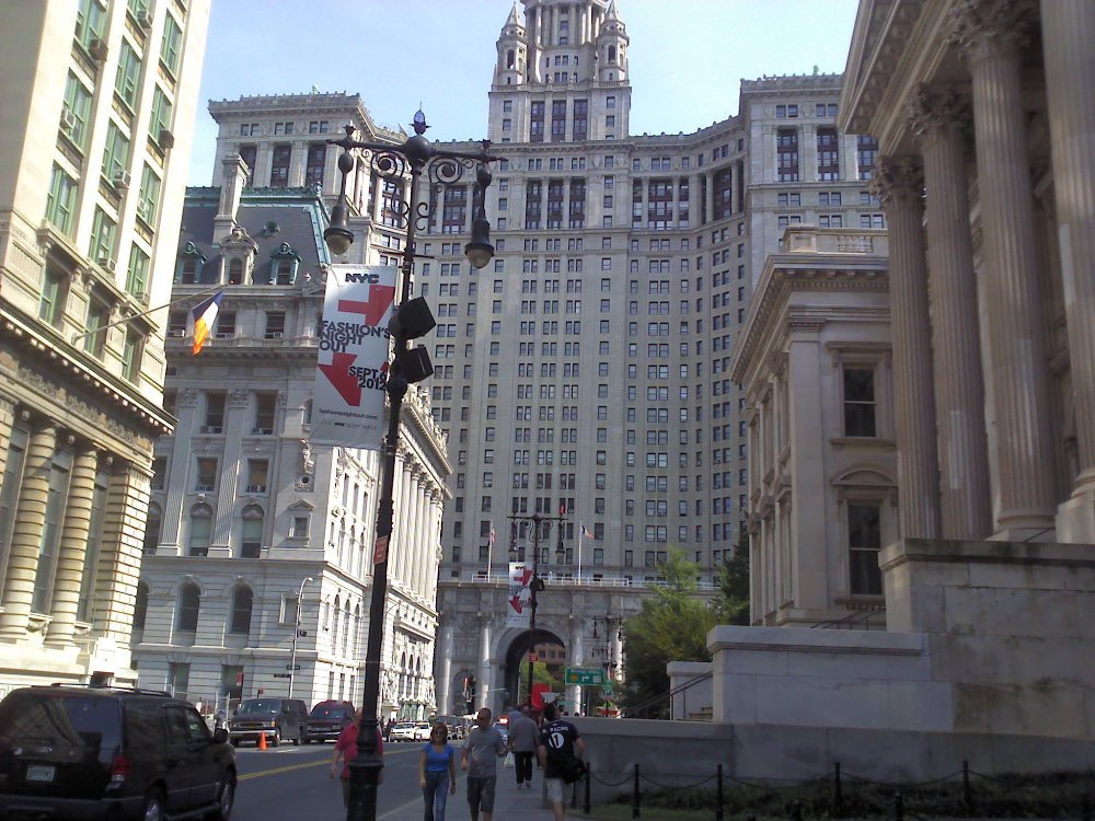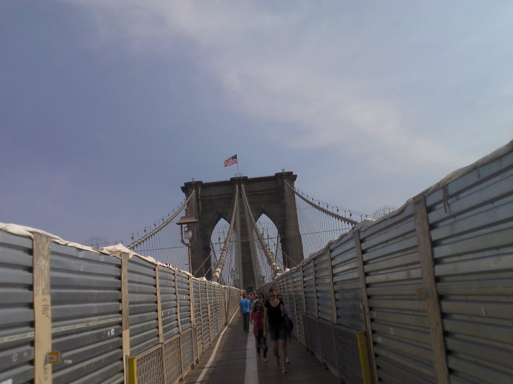 Empire State Building (tallest building by my right shoulder) from Brooklyn Bridge.