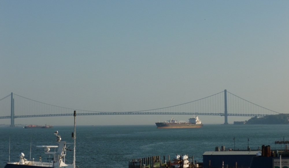 Verrazano Bridge, glimpsing the ocean beyond the harbor.