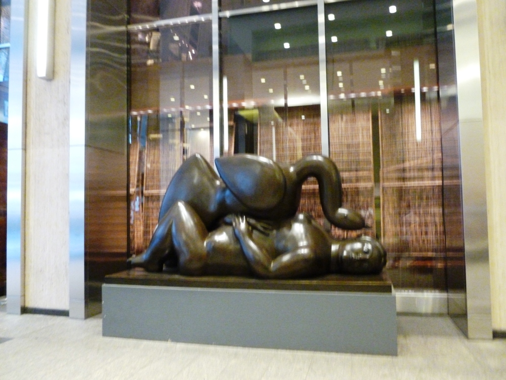On the way to the New York Museum of Modern Art, walking through the breezeway of a modern office building: