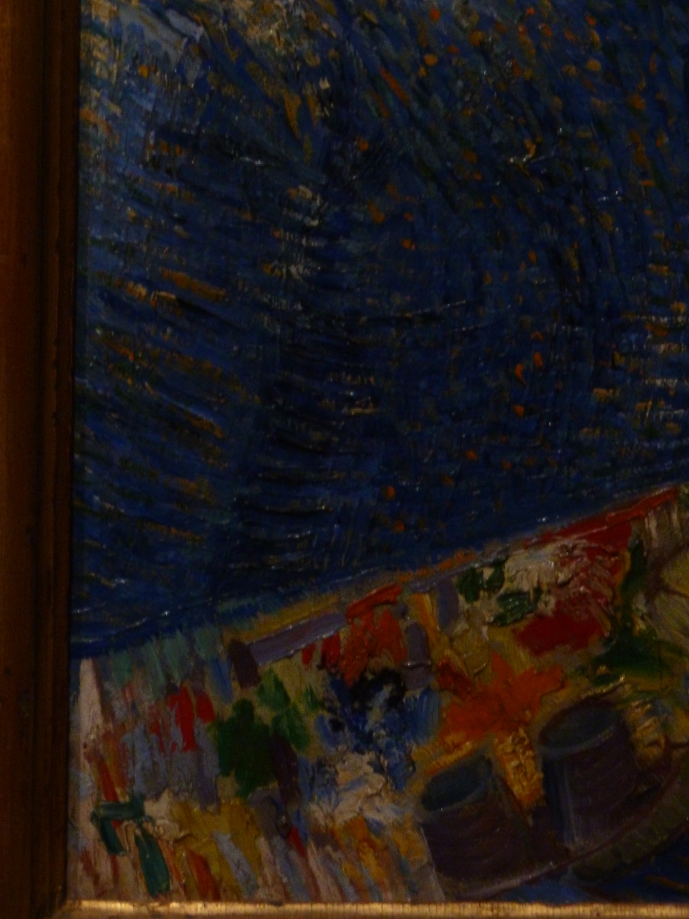 I used to think Van Gogh had a loose style. After seeing the paintings up close, I no longer think so. Although the images are constructed of many individual strokes of color, each of those paint strokes is carefully and deliberately applied. In this painting, see how the paint strokes are directional, showing different overall directions in the jacket.