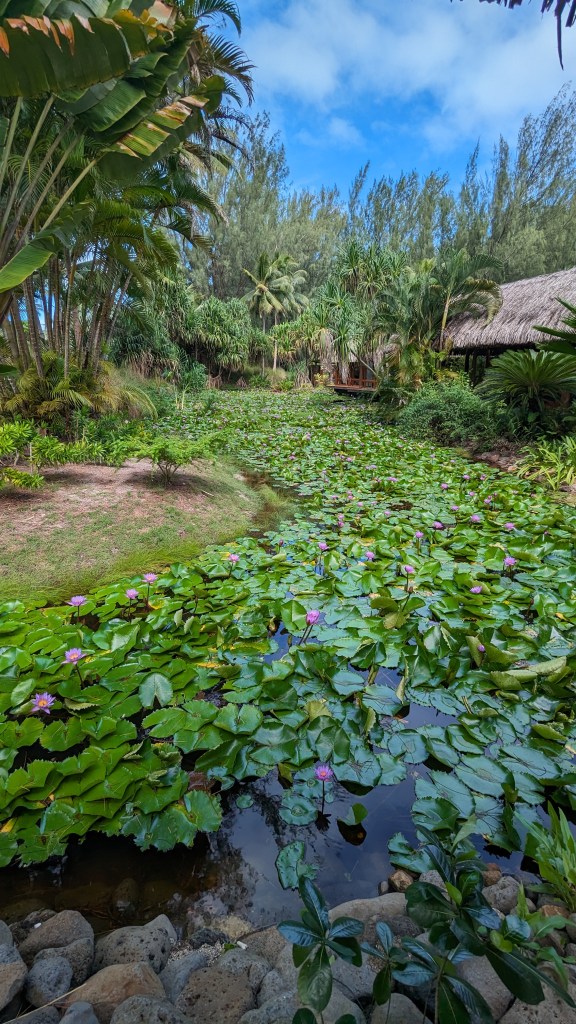 Today I want to jump in with the flowers. We stayed at The Bora Bora Resort with a lot of honeymooners and people celebrating anniversaries (like us). It’s a very peaceful environment where we finally experienced the over-water bungalow. That in itself is very cool. The sea laps and splashes around the pillars providing constant watery surround sound and the waves are visible even at night in the giant coffee because they light them in soft glowing blue. It’s like being in a boat without the rocking.