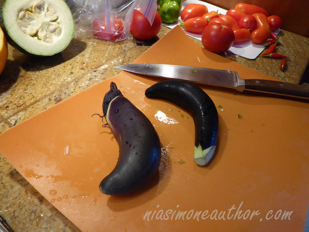 4. Chop all the veggies, but do the onions and garlic first, plus peppers, old gourds, and eggplant if you use them.