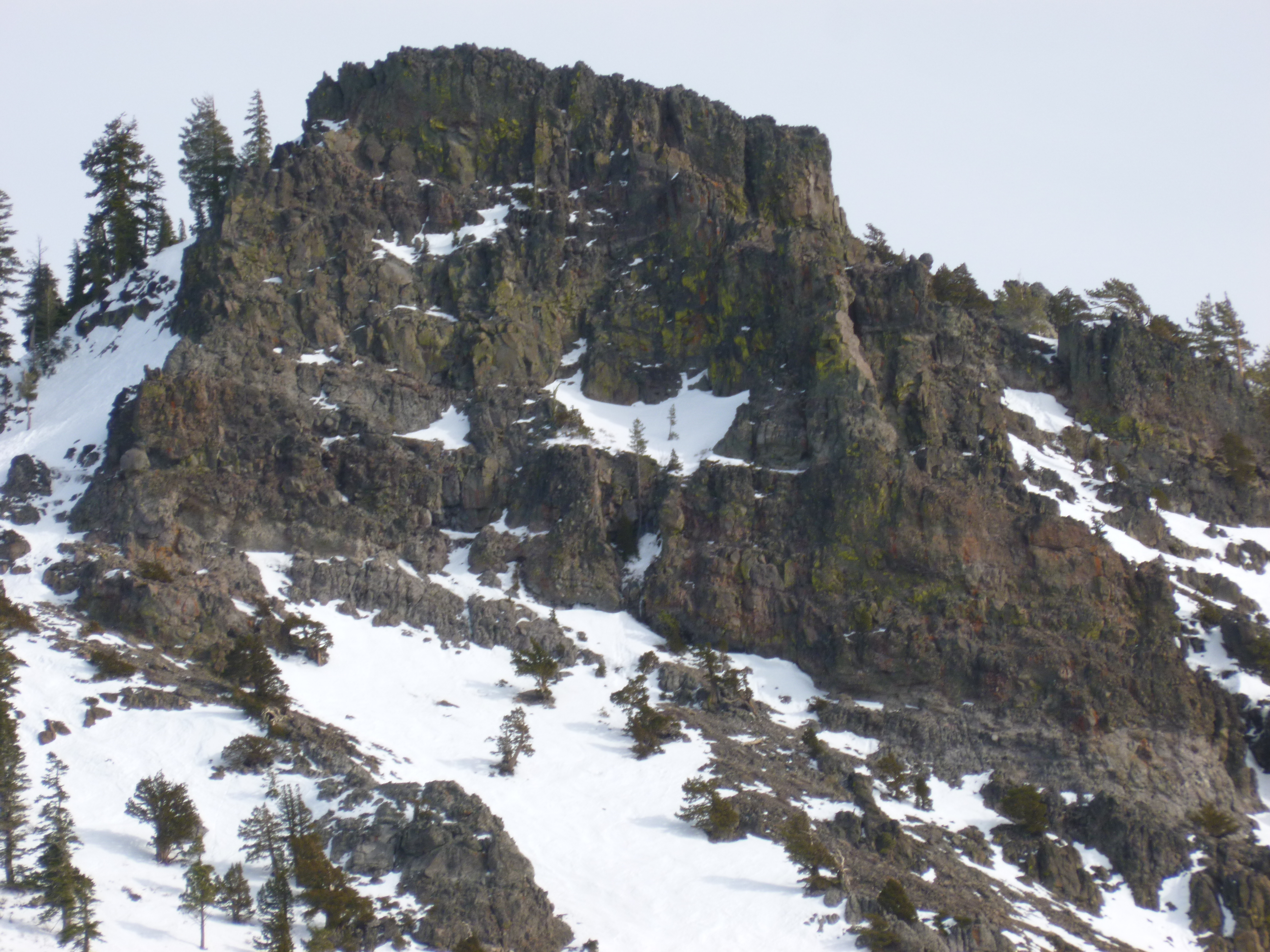 Practice mindfulness one more time, while waiting for husband to swap out demo skis. See Scott Peak not just as an imposing mountain but as a complex pattern of rugged, volcanic rock.