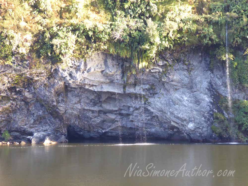 The Fiordland Navigator, our shipHeading toward that center island, and the Tasman Sea. (Photo altered for effect.)Water from the rains don’t get absorbed because there’s no soil. The water all cascades off the mountains into the fiord. The fresh water looks green where it meets the sea water because it is stained by the vegetation on its way down the mountain.