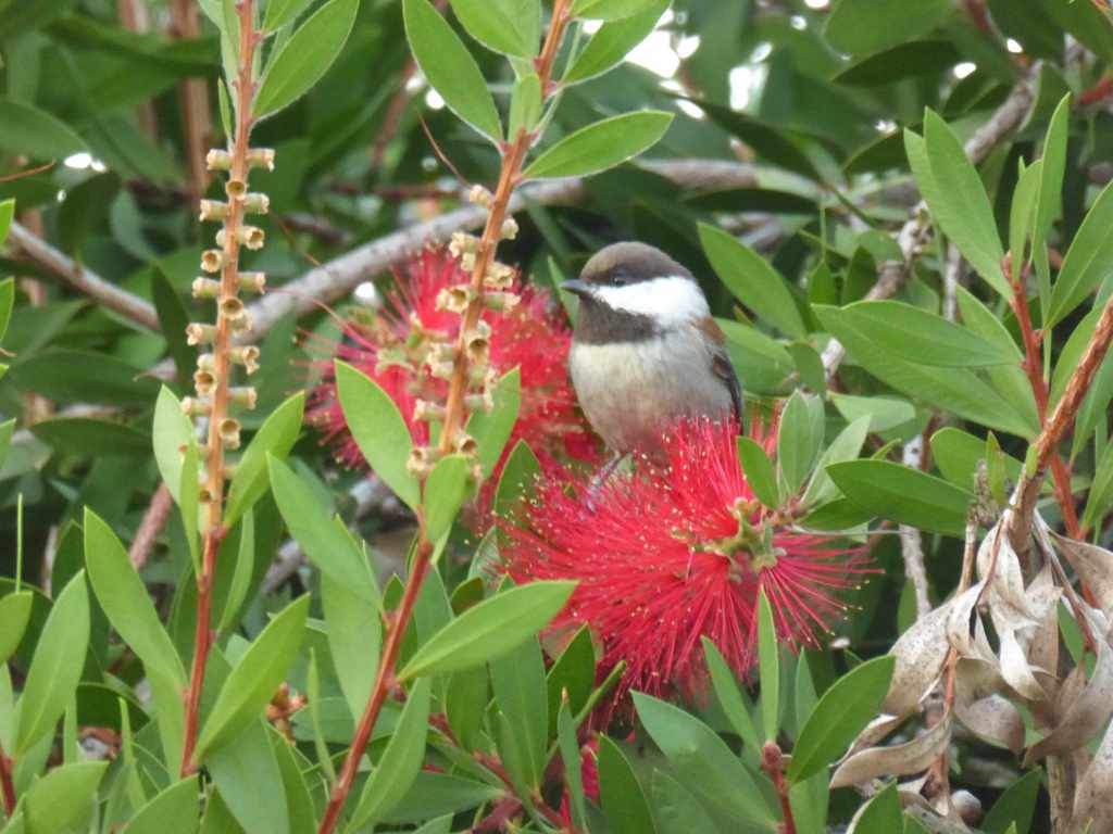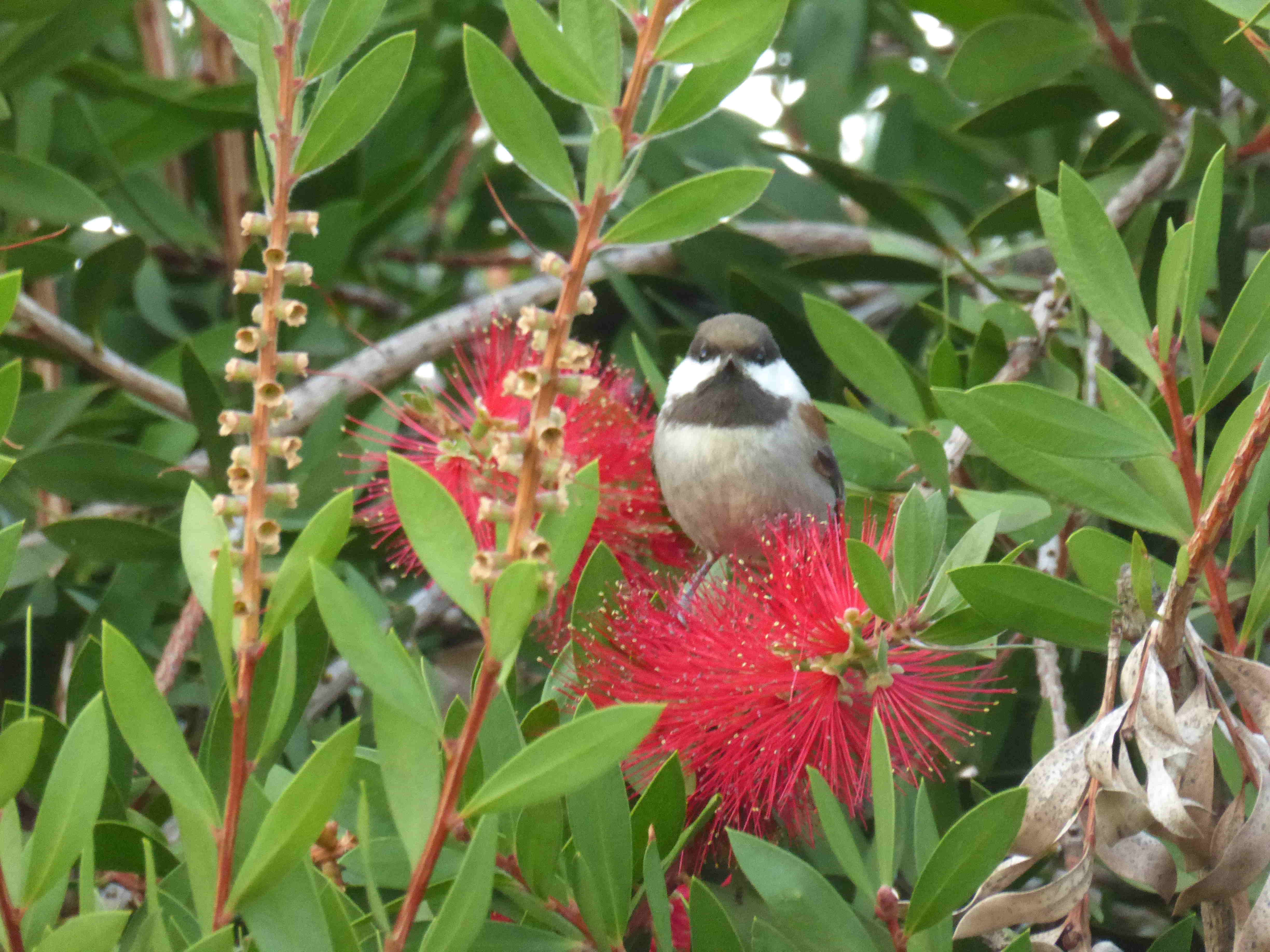 Actually now that I look at them, there are two kinds of birds here. The little black and white one was part of a small flock that was eating the bottle brush blossoms, the one on the feeder is a completely different kind.