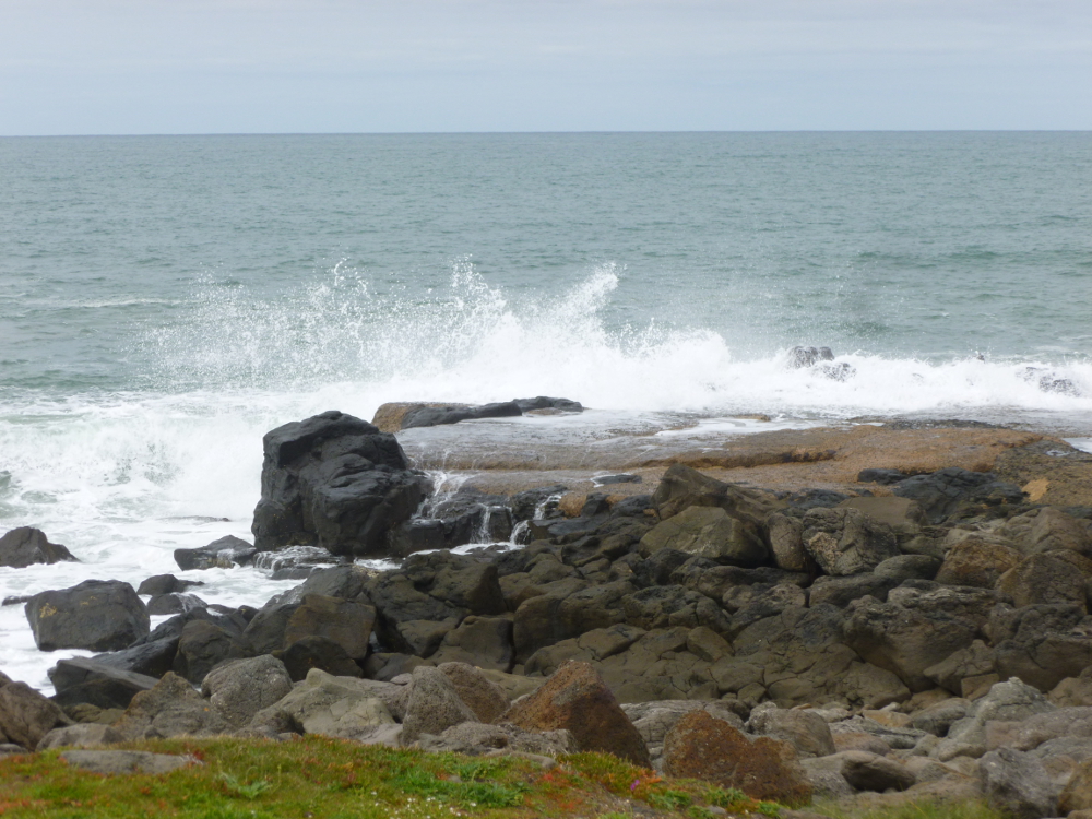 Then Leanne and I settled into trying to shoot stop-action waves while my hubby, the ever happy paleontologist-and-seaman-at-heart studied the rocks and gazed out over the waves.