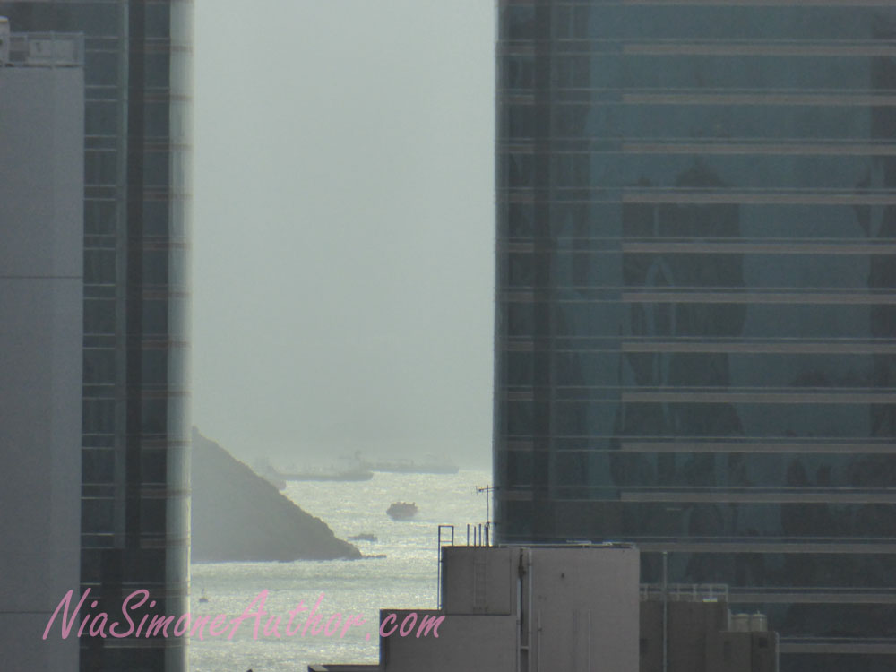The rain has stopped and I can see between the buildings to a far reach of Victoria Harbor.