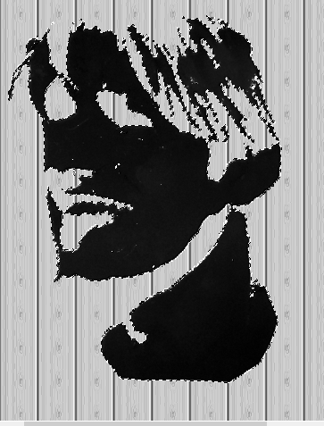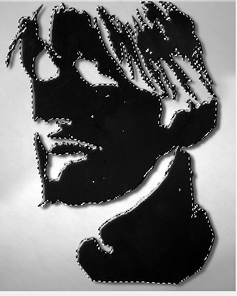 Do Tools->Selection Tools->Select by Colors again and click on the black part. Does Invert work now? No. That would be too easy. How about Edit->Fill with Background Color? Expecting the vinyl paneling in the stencil, get this instead, the whole point of the entire stenciling exercise!
