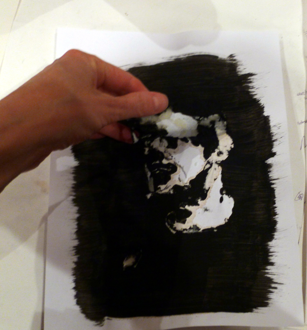 Step 3 again, this time using this cool wax you can get at the office supply (note the original stencil is black now):